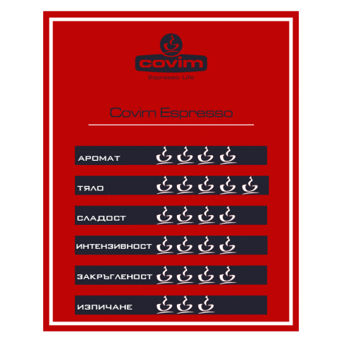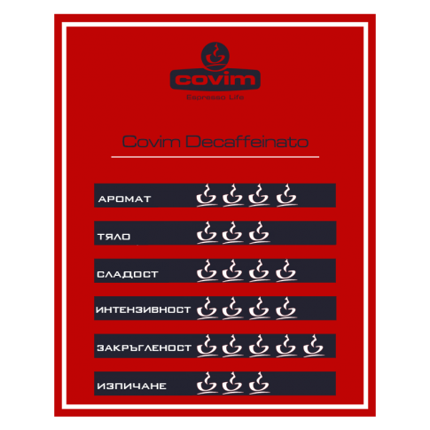 • Мляно кафе Covim „Decaffeinato“ – деликатен вкус и гъста кремообразна пяна.