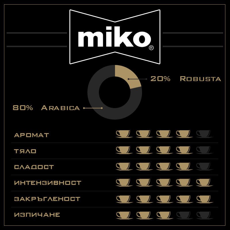 - Кафе на капсули „Miko „ 4U Espresso“ – висококачествен микс с кремообразна пяна и плътен вкус, идеално за еспресо, капучино или кафе макиато.